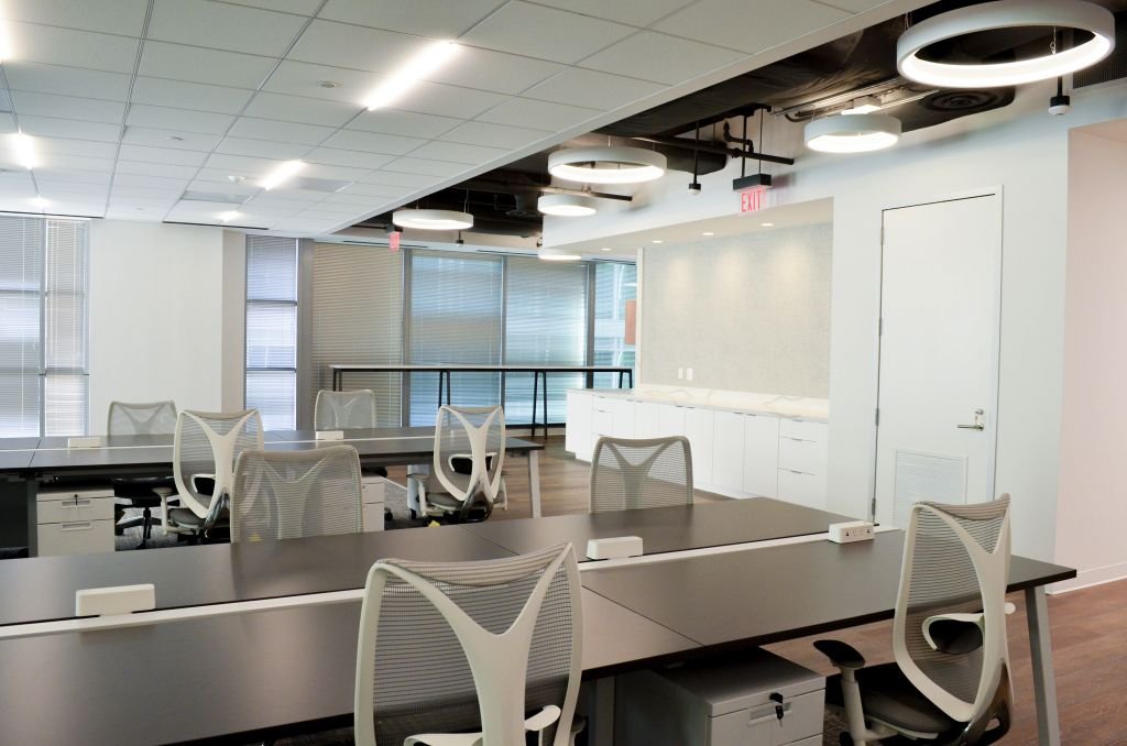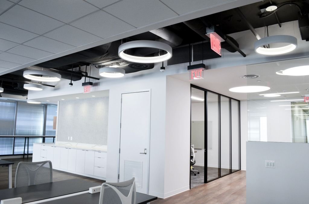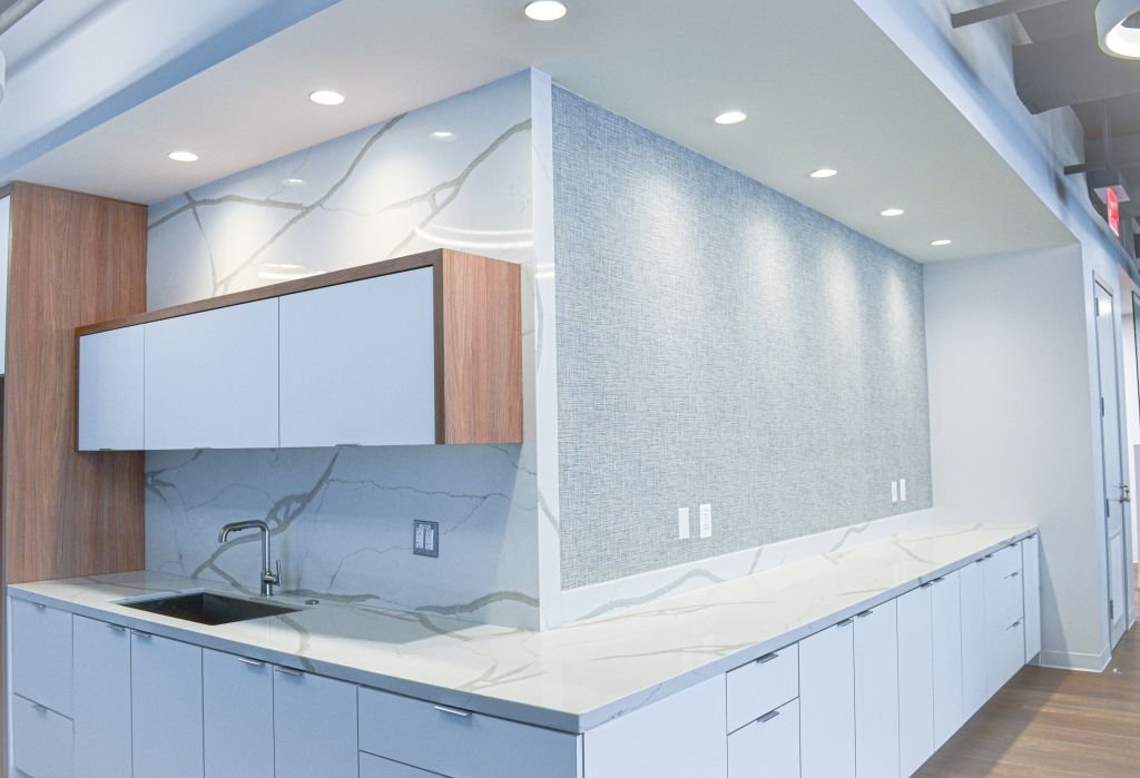 Detailed fit-out with high-end lighting package. Great use of Calcutta Stone for counters, credenzas, and accent wall placement. dHive glass system used for rooms.