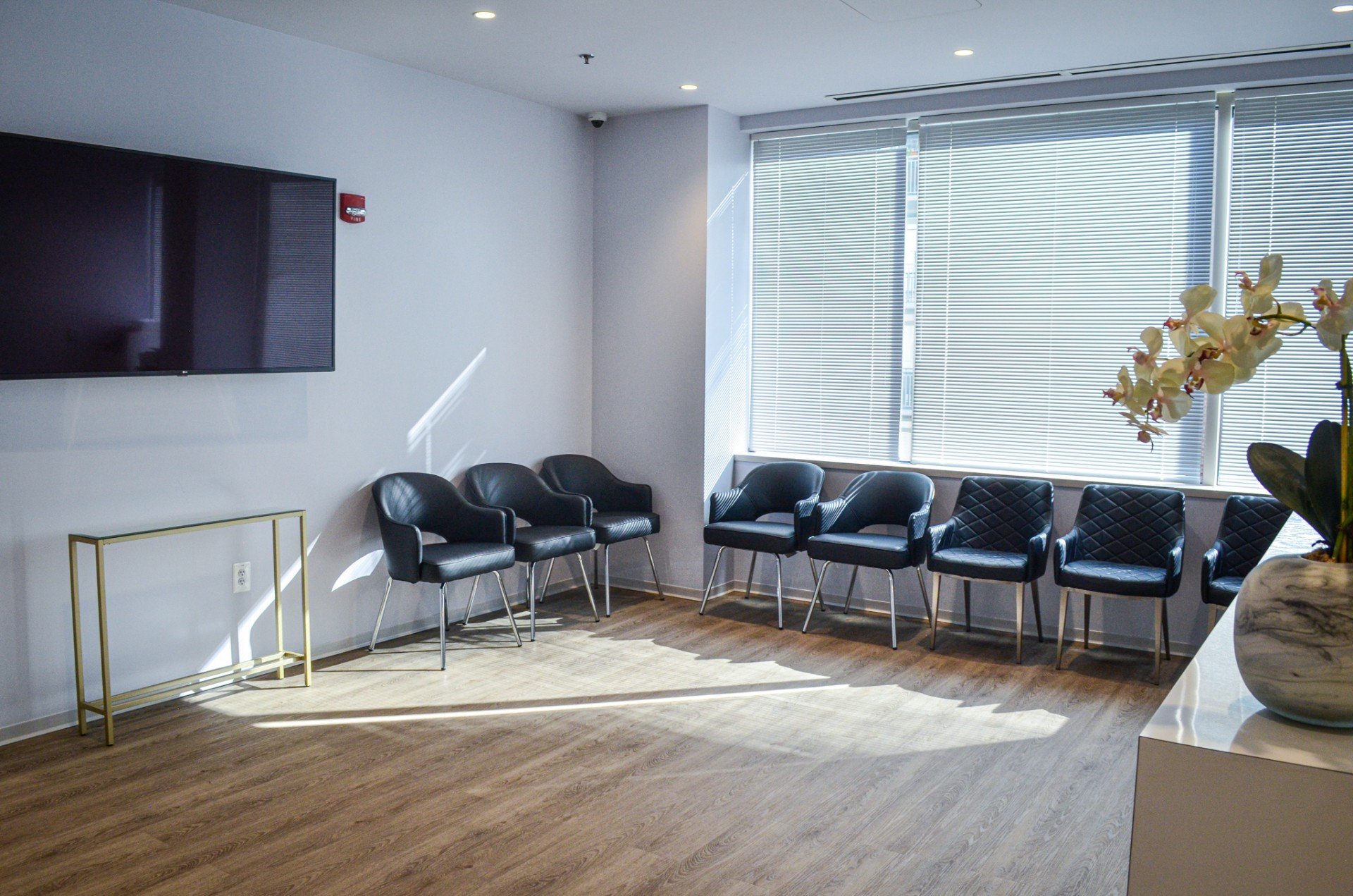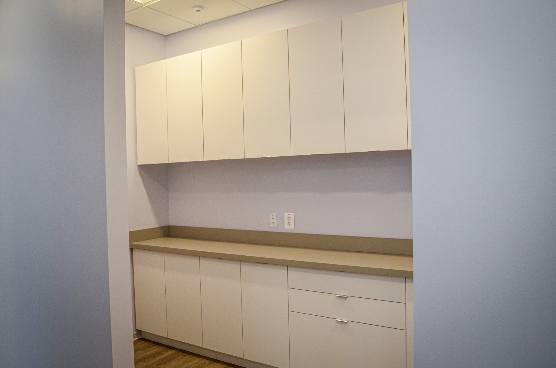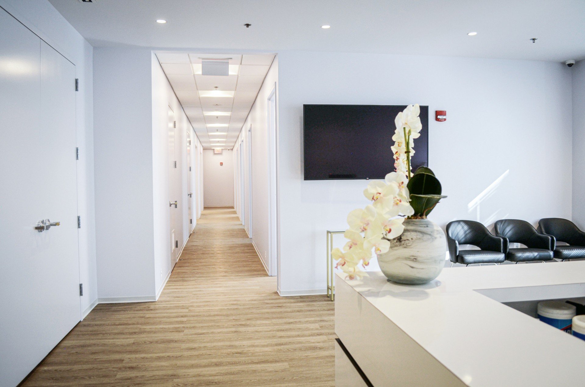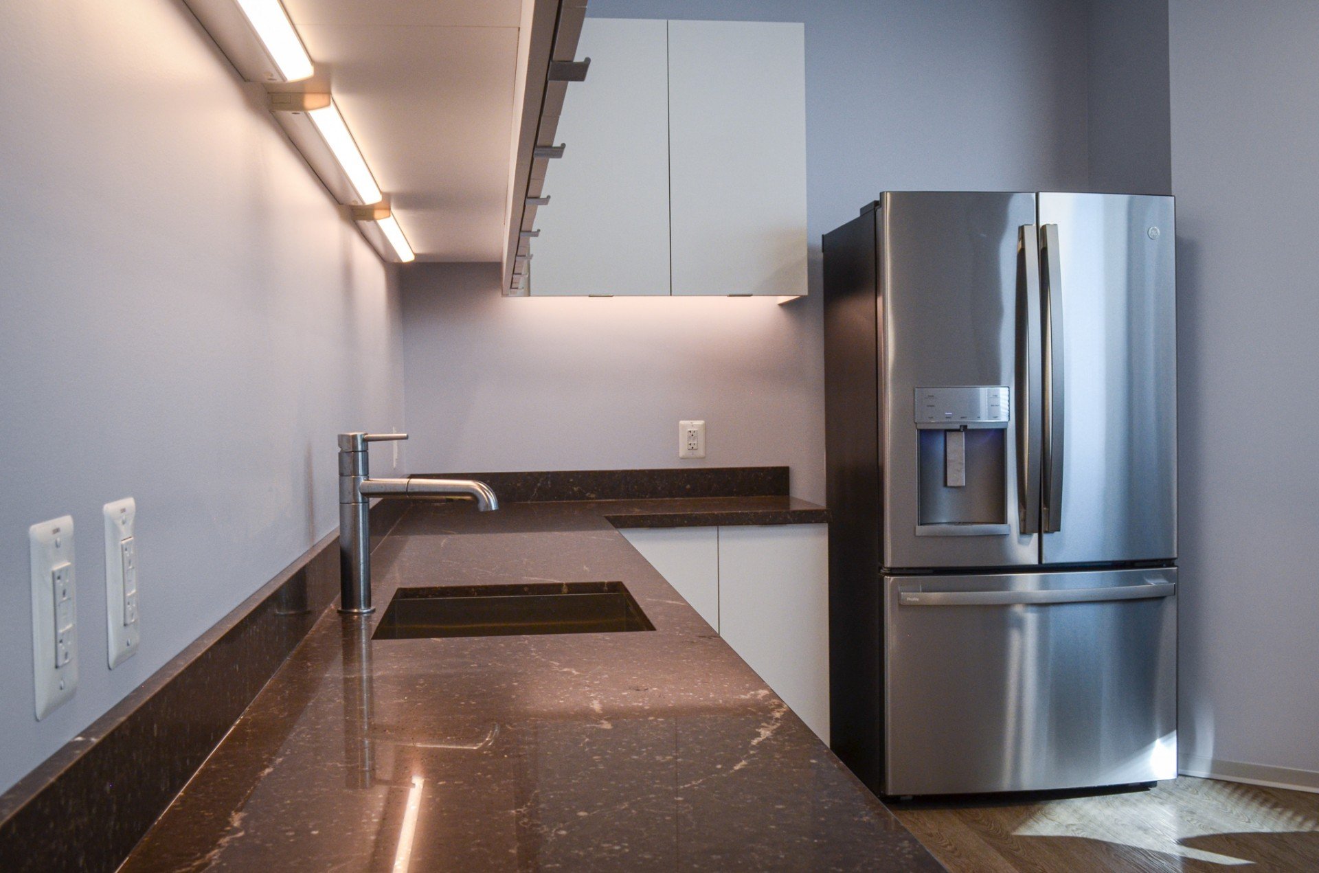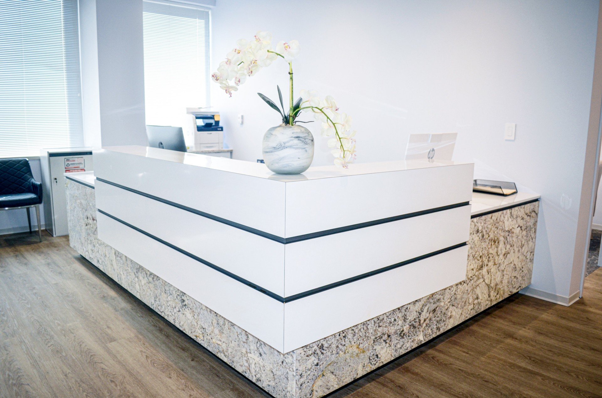 Custom built reception desk featuring beautiful white spring granite. Custom window film at unit entry. Renovation of kitchen and office areas. Space has balcony that ULTRA’s Waterproofing Division reworked using existing pavers.
